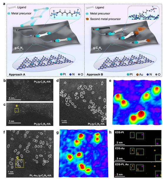 Linear 1,6-hexanediamine (HA) was used as the ligand with two amine groups to coordinate the two metal precursors. For homonuclear DACs, one HA molecule could restrict two Pt atoms by forming two Pt-amine complex end groups via dechlorination, then adsorbed on the 2D g-C3N4 support. For heteronuclear DACs, Pt single atoms are first fixed on the g-C3N4 surface by Pt-N electrostatic interaction. After the HA ligand was added, one end amine coordinates with Pt with lower adsorption and electron transfer, and the other end amino group of HA then traps free Au via dechlorination, finally forming Pt-Au heteronuclear DACs. Benefitting from the efficient electrostatic coordination interaction between metal atoms and the nucleophilic nitrogen atoms of diamine ligands and 2D supports, the DACs can reach more than 82% of the pairing ratio, significantly outperforming those of the previously reported DACs. As a model system, the highly paired Pt1-Au1/g-C3N4-HA exhibited around three times the catalytic activity (744 mg h−1 mgmetal−1) in NO3−RR compared with the unpaired Pt1-Au1/g-C3N4-none (255 mg h−1 mgmetal−1) due to the high-quality two-site synergistic catalysis. This strategy can be extended to prepare various homo- and heteronuclear Pt-Au based DACs with precise and efficient control of metal atomic distance, offering both accessibility and practicality for advanced catalytic applications.